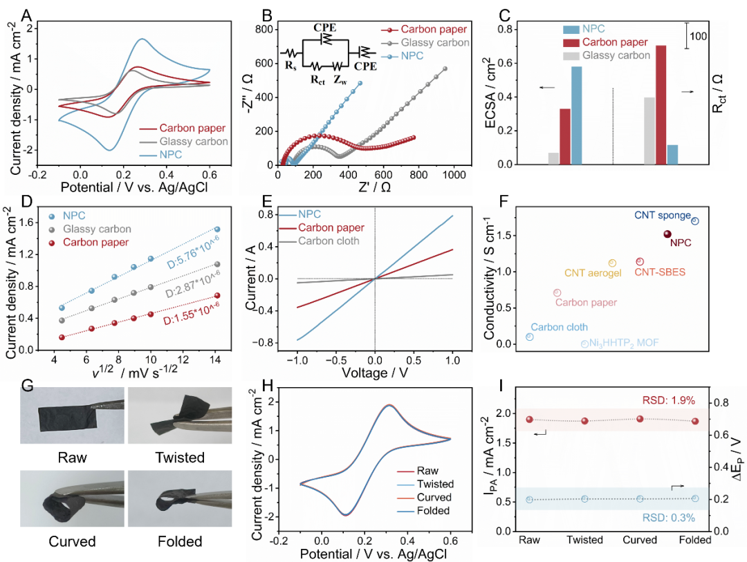 电化学测试表明相较于商业化玻碳、碳纸或碳布电极,NPC具有更大的电化学活性面积、更快速的电荷转移速率,以及更高的扩散系数和本征电导率;并且在不同形变下NPC的电化学活性几乎未发生衰减,证实其具有优异的机械柔性。