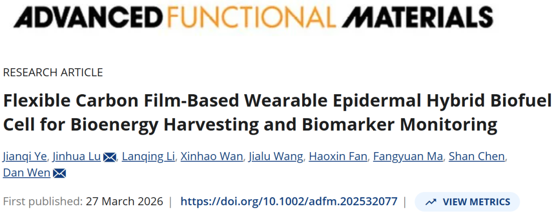材研“1-0” | 文丹、卢锦花教授AFM:基于柔性碳膜的可穿戴表皮混合型生物燃料电池用于生物能量采集与汗液生物标志物监测