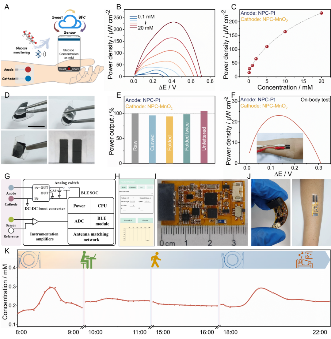 以热塑性聚氨酯为柔性基底构建可穿戴生物燃料电池器件,该可穿戴生物燃料电池具有良好的皮肤保形性,且在不同形变(弯曲、折叠等)下功率输出变化小于6%,证实其良好的机械柔性。在体实验表明该可穿戴生物燃料电池可从人体汗液中获取能量,与柔性信号处理电路集成可实现汗液葡萄糖的实时监测,并以高效液相色谱验证了其监测准确性。