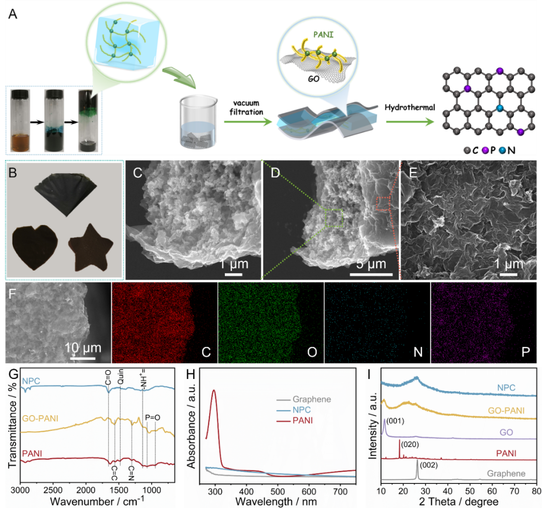 通过真空抽滤氧化石墨烯与聚苯胺水凝胶混合溶液,并经水热还原得到自支撑柔性碳膜(NPC)。形貌表征显示NPC呈现“三明治”结构,即聚苯胺衍生的树突状交联纳米棒紧密封装于石墨烯片层之间,并且N、P异质元素在碳膜结构中分布均匀;FTIR、XRD等谱学表征证实了石墨烯与聚苯胺之间的相互作用,可有效提升NPC机械性能。