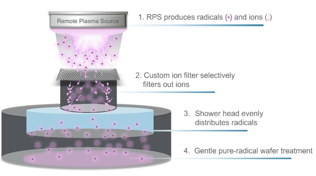 Viva 采用一种基于自由基的专利方法来应对这些挑战,该方法仅向晶圆输送纯氢自由基,同时过滤掉可能造成等离子体损伤的高能离子。这些自由基会被硅吸收,降低其表面能(类似于降低张力)。这使得界面处的原子能够移动并重新排列成更平滑的结构——就像软化布料,让褶皱能轻松被熨平一样。