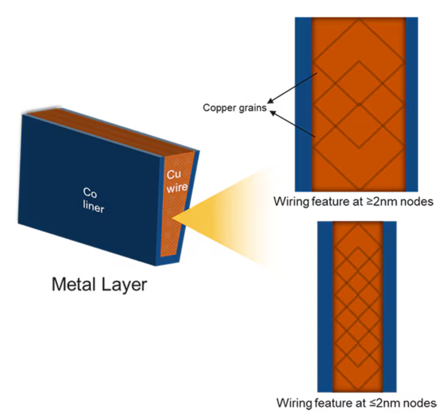 Viva 在先进工艺节点的芯片布线中也发挥着关键作用。铜由许多微小的晶粒组成,在晶粒之间的界面(即晶界)处,电子会发生散射并失去动量,就像撞上减速带一样。随着导线尺寸缩小,晶粒会变小,晶界数量会增多,电阻也随之上升。此外,为了保证这些细导线的可靠性,会添加少量锰等掺杂剂,但如果设计不当,这些掺杂剂也会增加电阻。