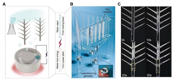 协同回收:构建水-电循环新路径。研究团队进一步研制了仿生集雾装置,模拟自然界高效捕获水汽的过程。通过将该装置与自驱动发电机集成,团队构建了一个闭环的能量转换循环:不仅能利用余热驱动液滴发电,还能回收冷却塔排放的水蒸汽并将其重新转化为液态水进行循环利用。