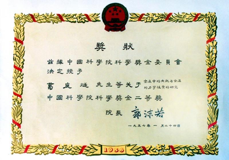 经过为期1年多的评审,最终从全国申报的419件请奖著作中评选出34项获奖成果(一等奖3项,二等奖5项,三等奖26项)。其中,李薰和葛庭燧分别以《钢中氢气的研究》《金属中的内耗与金属的力学性质的研究》荣获三等奖和二等奖。