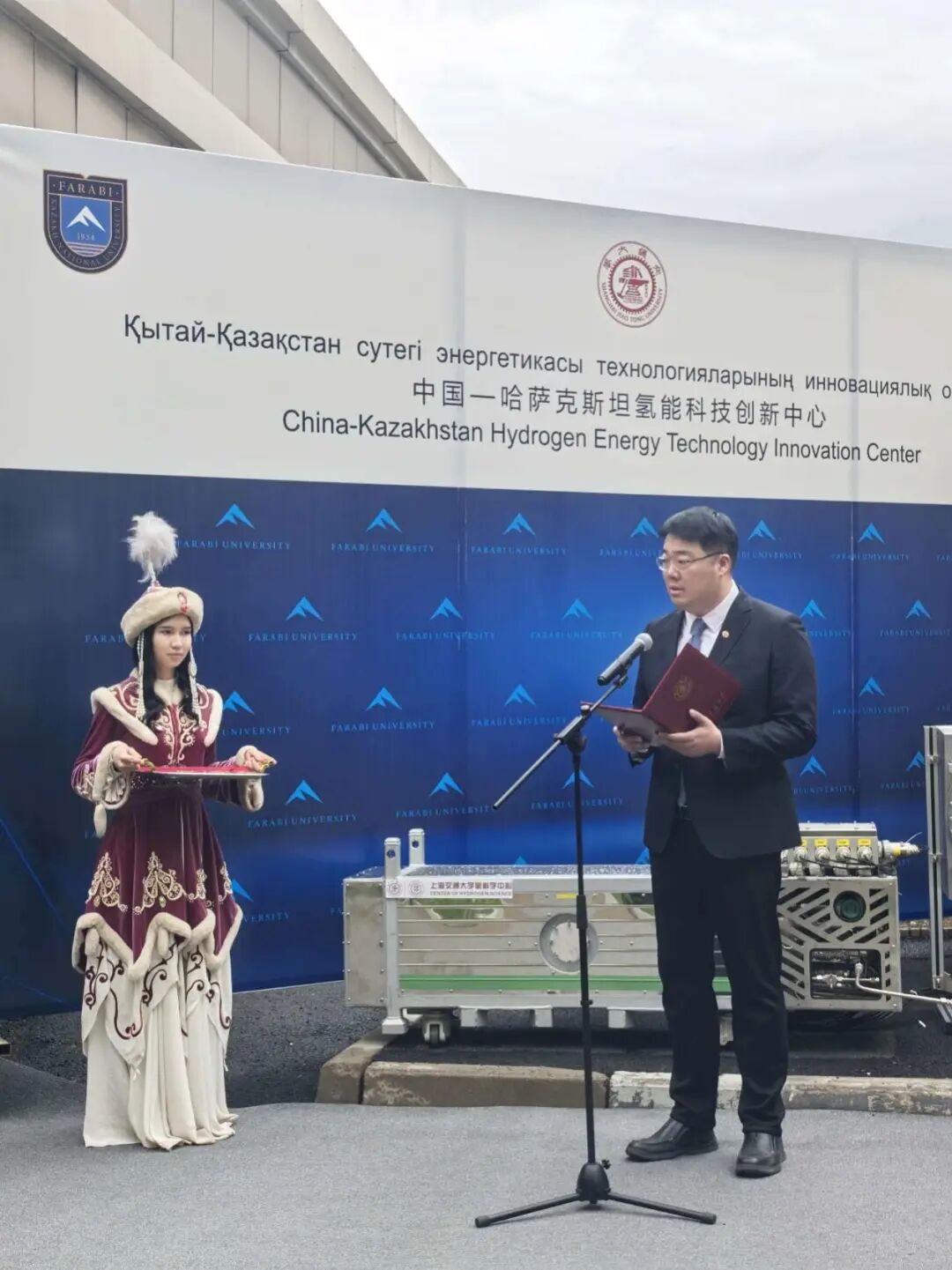 陆琪代表上海交通大学致辞并为中国-哈萨克斯坦氢能科技创新中心揭牌,陈科启动设备。