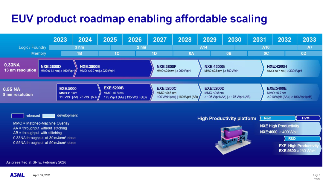 “在人工智能相关基础设施持续投资的推动下,半导体行业的增长前景持续向好。芯片需求正超过供给。为此,我们的客户在与客户签订的长期协议支持下,正加快2026年及以后的产能扩张计划。过去几个月,客户上调了对我们产品的短期和中期需求预期。因此,ASML 的订单接收量持续保持高位,我们正与客户紧密协作,通过交付新系统和对现有设备进行性能升级相结合的方式,满足客户的需求。这些业务动态支撑了我们的预期,即 2026 年将是我们所有业务再度实现增长的一年。”