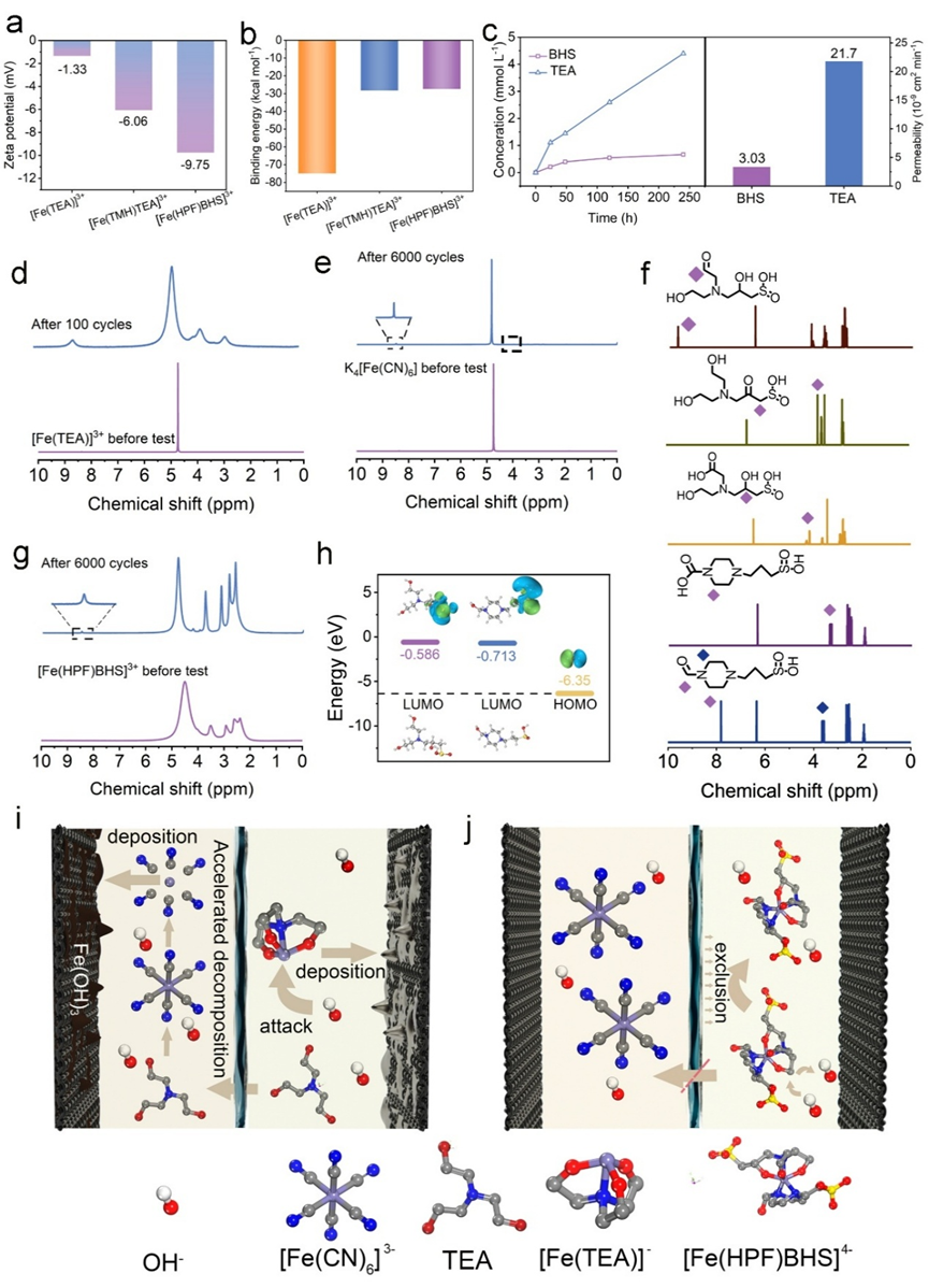 团队从分子结构出发,以12种富含羟基、磺酸基的有机配体为基础,设计合成11种结构精准调控的铁配合物,经理论计算与多轮筛选,最终确定[Fe (HPF) BHS]⁴⁻双配体螯合负极液 (图1)。该配合物通过多齿强配位构筑大空间位阻结构,同时利用磺酸基与羟基形成负电荷界面,借助Donnan排斥效应实现双重保护:一方面有效阻挡氢氧根对铁离子中心的侵蚀,避免活性物质分解;另一方面显著降低活性物质与游离配体的跨膜渗透(图2),从根源解决电解液交叉污染与降解失效难题,全面提升电池长期运行稳定性。