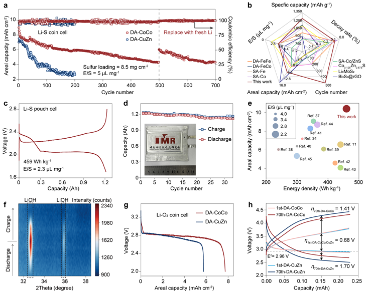 中国科学院金属研究所沈阳材料科学国家研究中心先进炭及二维材料研究部的科研人员聚焦电池催化材料与反应物质间的电子输运方向,重新定义了电池用催化材料的设计准则,提出了以产物电子性质为核心的新思路,突破了常规热力学描述符的局限性。基于该准则发展的催化材料能改变产物的绝缘性,在反应过程中,维持高效的催化活性,显著提升了转化型锂硫电池与锂氧电池的性能。所构建的安时级软包锂硫电池的能量密度超过450 Wh kg-1,验证了上述准则在实际复杂体系中的有效性。研究成果近期以“Breaking insulating barriers in solid-phase conversion reactions with dual-atom catalysts for high-energy lithium batteries”为题发表于《Nature Catalysis》期刊上。