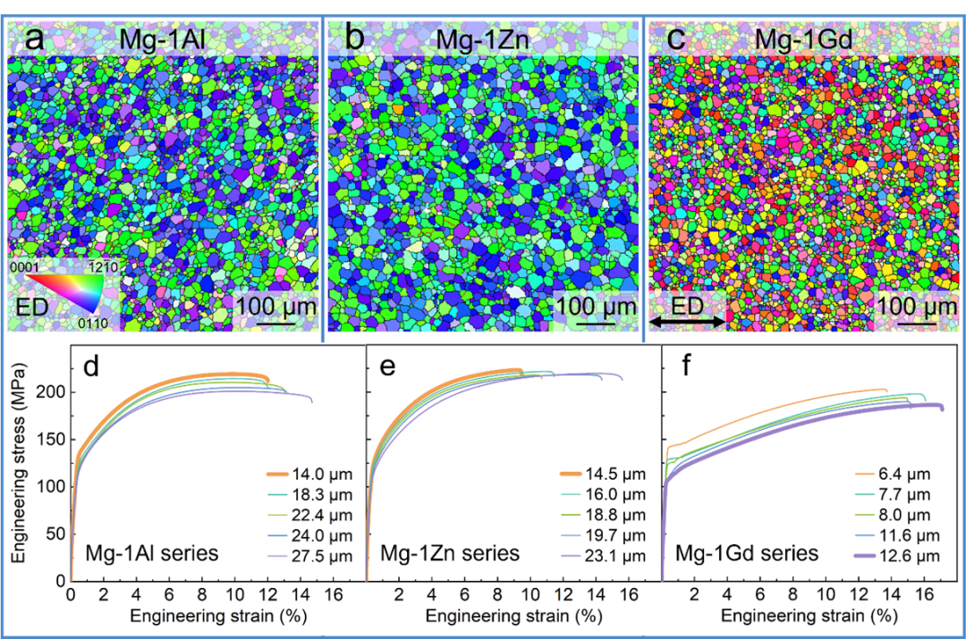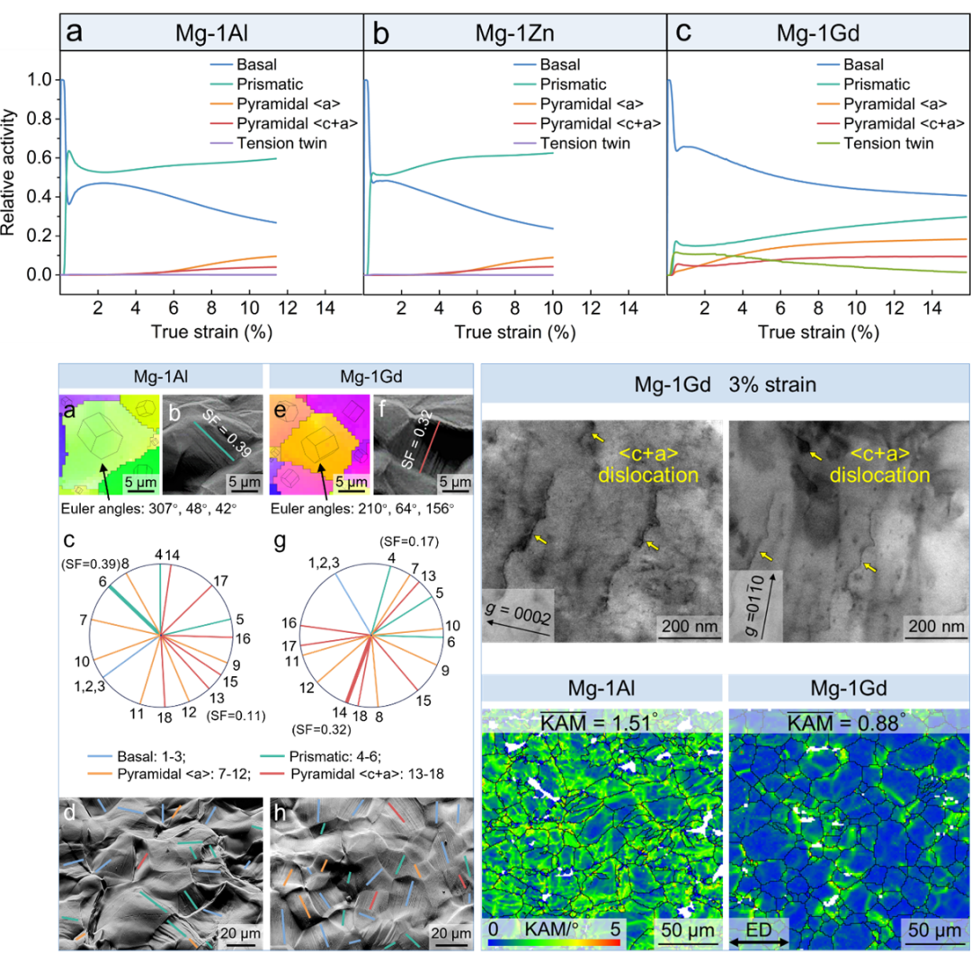 研究团队通过精细调控挤压工艺,制备了晶粒尺寸匹配的Mg-1Al、Mg-1Zn和Mg-1Gd合金,在排除Hall-Petch效应干扰的前提下,系统比较了三种合金的变形行为。结合晶体塑性模拟(EVPSC)、滑移迹线分析、TEM位错表征及单晶微柱压缩实验,揭示了多晶与单晶Mg-Gd合金中<c+a>滑移行为的显著差异。