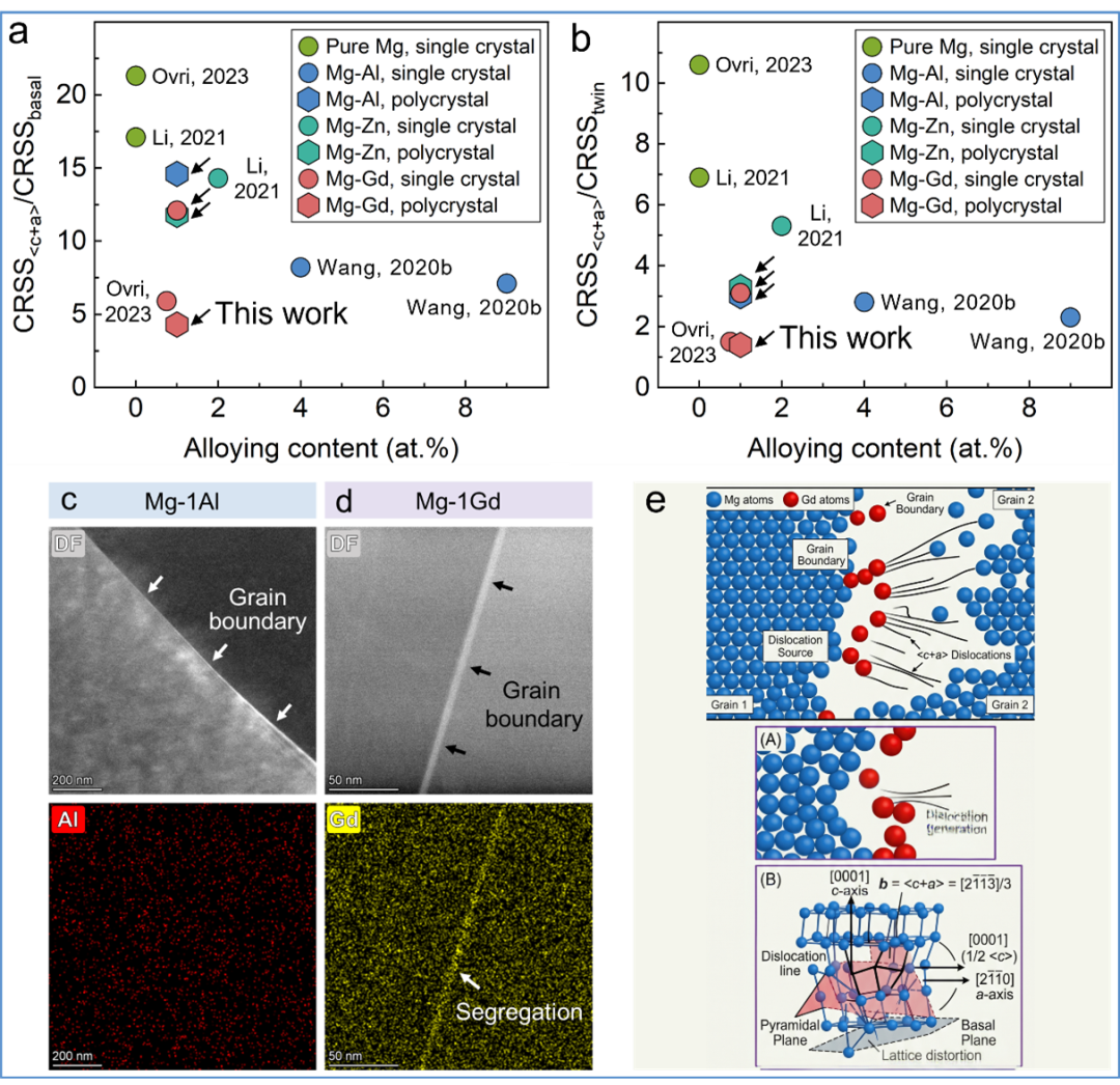 镁作为最轻的金属结构材料,在航空航天、轨道交通等领域应用潜力巨大。然而,其密排六方晶体结构导致室温下可启动的滑移系有限,尤其是协调c轴变形的关键载体——锥面<c+a>位错激活应力极高,难以有效开动,成为制约镁合金延展性的核心瓶颈。尽管稀土元素Gd被证实能提升镁合金塑性,但其促进<c+a>滑移的机理长期存在争议:单晶实验显示Gd对<c+a>滑移本征阻力影响有限,而多晶材料中却表现出显著的<c+a>滑移活性增强。这一矛盾亟待澄清。