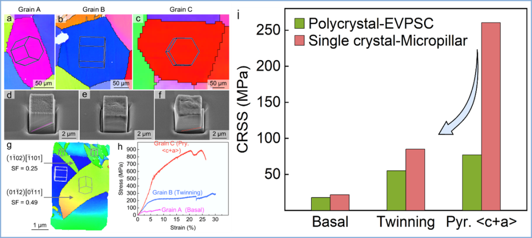 研究结果显示,多晶Mg-Gd表现出更低的<c+a>滑移临界分切应力(CRSS)和更高的滑移活性,同时孪生被抑制,从而获得更高的应变硬化能力和更优的拉伸塑性。单晶微柱压缩结果却显示,Mg-Gd中<c+a>滑移的CRSS仍高达约260 MPa,远高于多晶中拟合值(~77 MPa),表明单晶本征阻力的变化无法解释多晶中的增强现象。