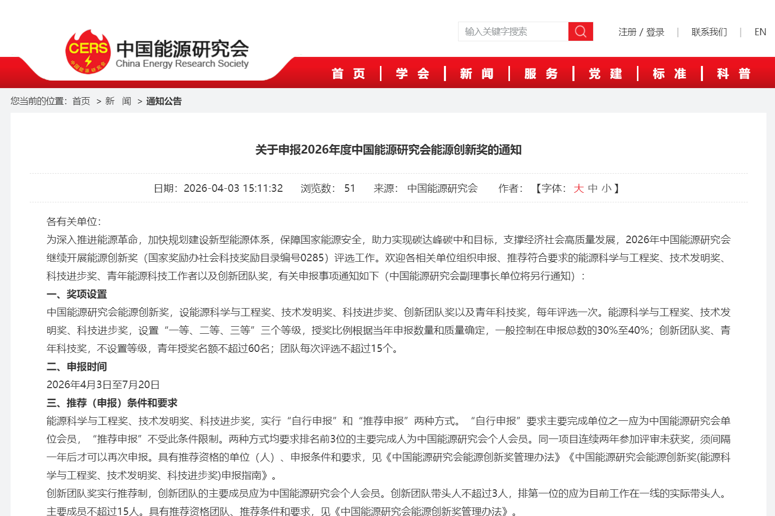 2026年度中国能源研究会能源创新奖开始申报—新闻—科学网