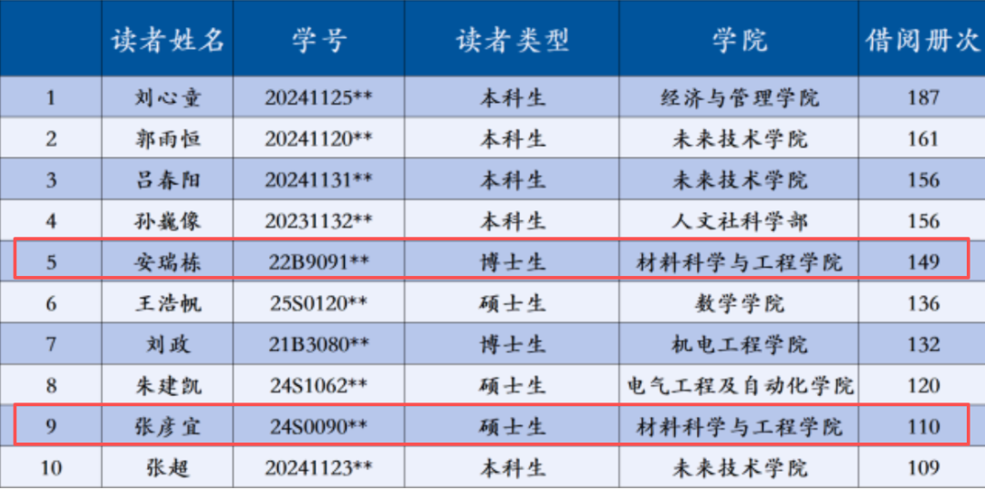 在4月23日“世界读书日”到来之际,哈尔滨工业大学图书馆根据2025年学生读者借阅数据,评选出借阅量排名前十位的“阅读之星”。其中,材料科学与工程学院共有两位同学上榜——博士生安瑞栋位列第五,硕士生张彦宜位列第九。他们以书为舟,以勤为桨,在字里行间践行着“规格严格,功夫到家”的阅读信仰。