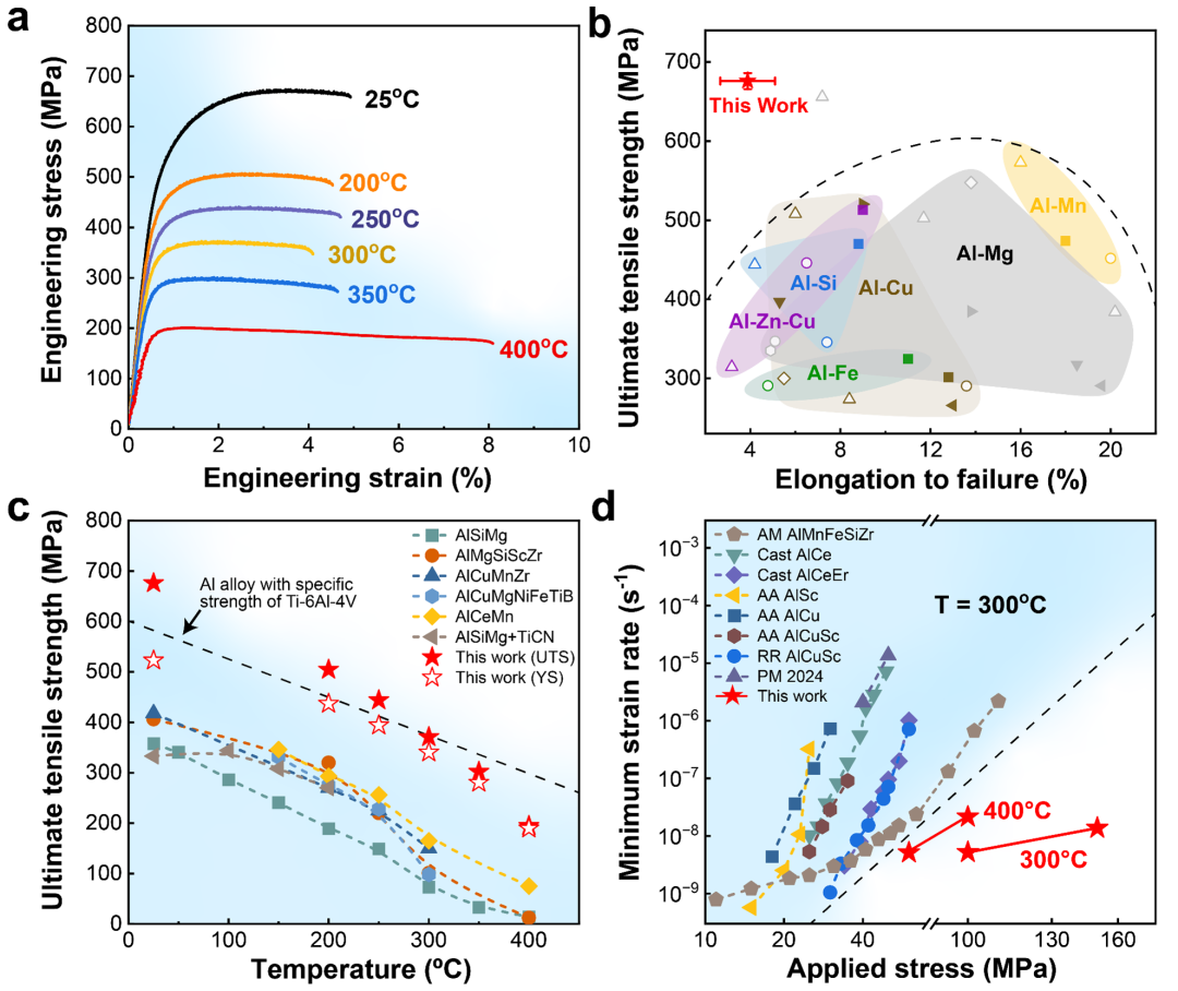 研究团队以高溶质含量的FVS0812铝合金为对象,利用激光粉末床熔融(LPBF)快速凝固过程中的溶质再分配,在合金内部原位形成连续三维“晶体-非晶”互穿网络结构;同时引入纳米TiB2颗粒作为形核剂,促进等轴晶形成并抑制热裂纹。该打印合金晶粒细小且成形性良好,能够直接制造复杂构件。同时,该合金实现了“打印即用”,无需后续热处理便展现出突破性的力学表现。其室温抗拉强度高达676 MPa,较现有增材制造铝合金提升至少100 MPa。在高温环境下,其力学性能同样出众:400℃以下的抗拉强度较同类材料高出180 MPa以上;300℃以下的比强度更是超越了常用的Ti-6Al-4V钛合金,且抗蠕变能力显著提升。