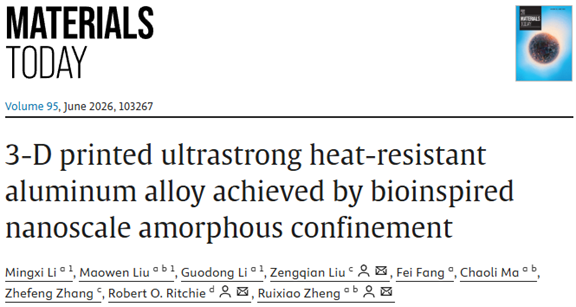 近日,北京航空航天大学材料科学与工程学院马朝利、郑瑞晓团队,联合中国科学院金属研究所张哲峰、刘增乾团队,美国加州大学伯克利分校Robert O. Ritchie团队提出了一种仿生纳米限域设计新策略,在3D打印耐热高强铝合金研究方面取得新进展。相关研究成果以“3-D printed ultrastrong heat-resistant aluminum alloy achieved by bioinspired nanoscale amorphous confinement”为题,发表于国际材料顶级期刊《Materials Today》。