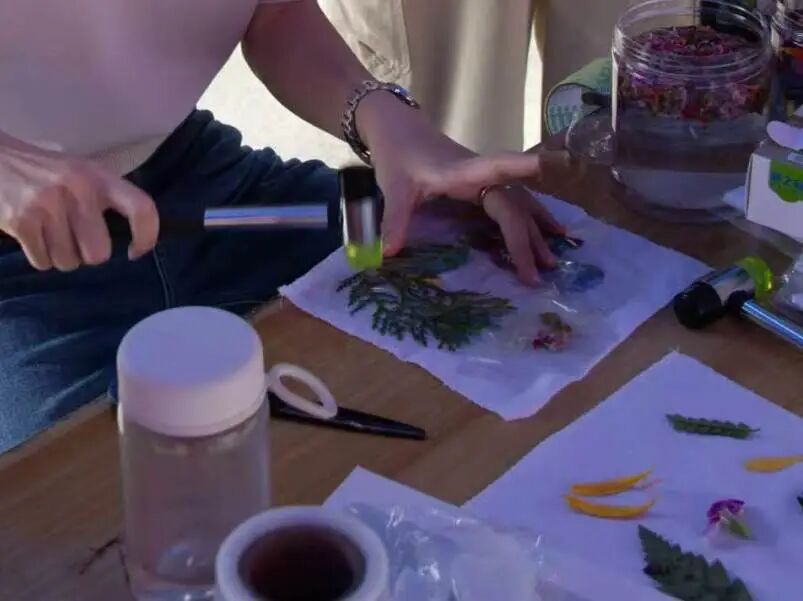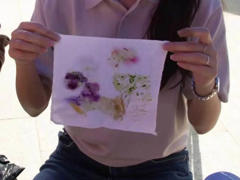 “花影入衣”拓染工坊里,同学们以花枝为笔,以帆布为纸,轻锤慢拓,浸染出自然的青蓝与嫩绿。每一次敲击都让花草的脉络更清晰,每一次晾晒都让春日的色彩更稳固。最终到手的,是世上唯一、永不褪色的春日风景,将春天随身带走。