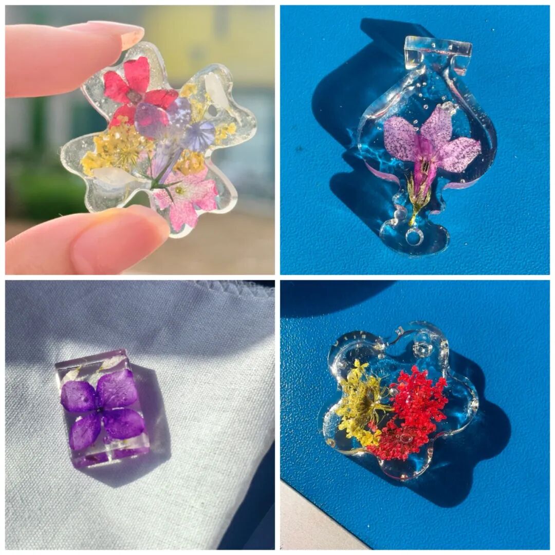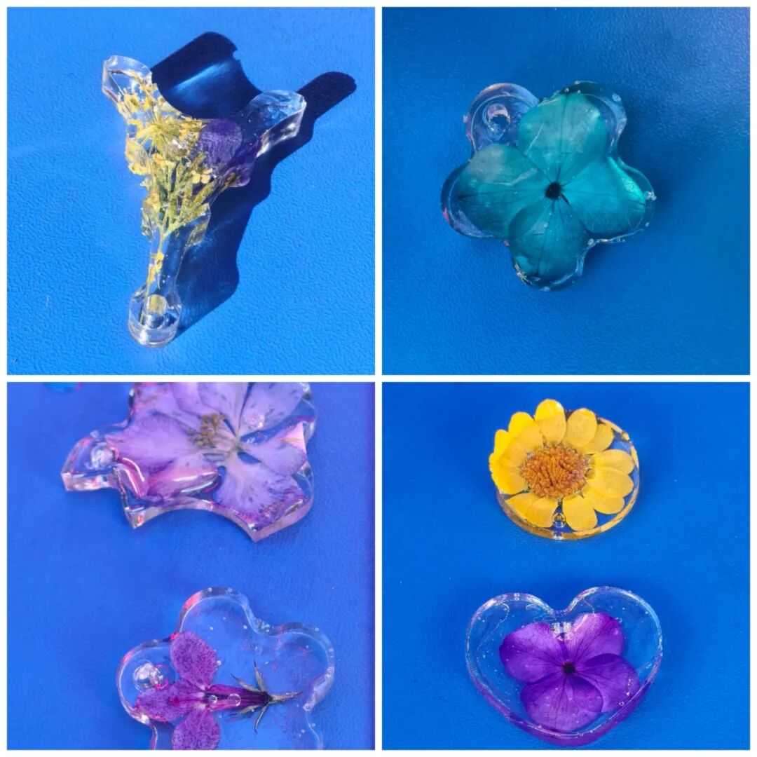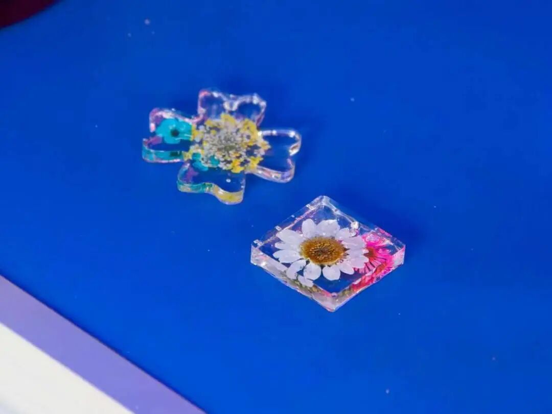 树脂封花体验中,同学们将干花妥善安放,缓缓倒入透明树脂。看着液体慢慢包裹花瓣,如同亲手制造了一块春日琥珀。静置、成型、脱模,那一刻,一朵花从此进入永恒的温柔。每一片花瓣都被精准定格,让春天有了可触碰的形状。