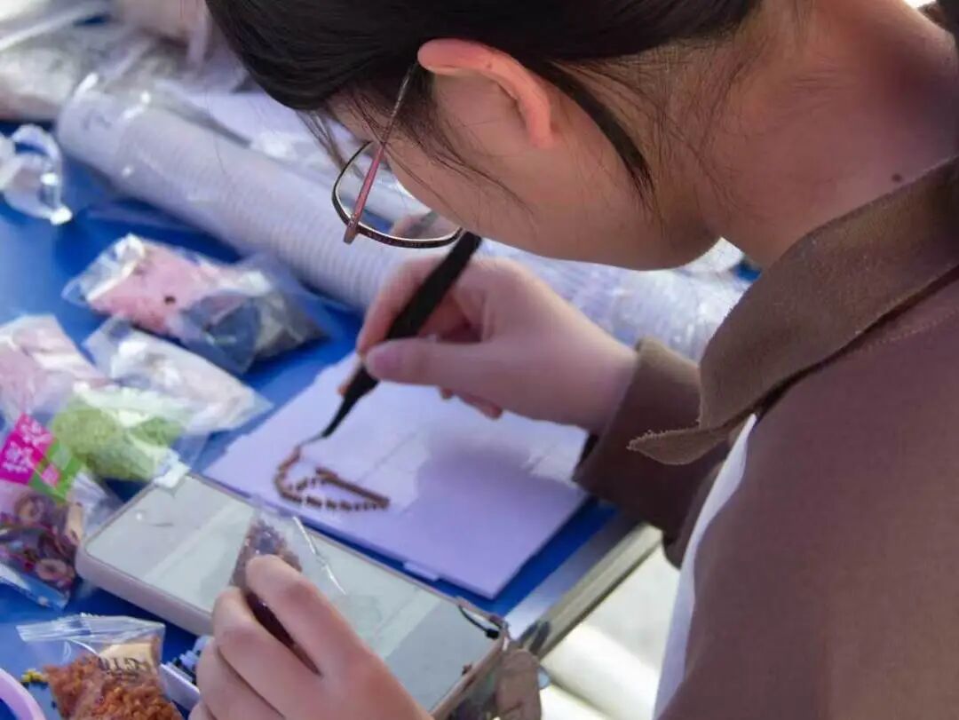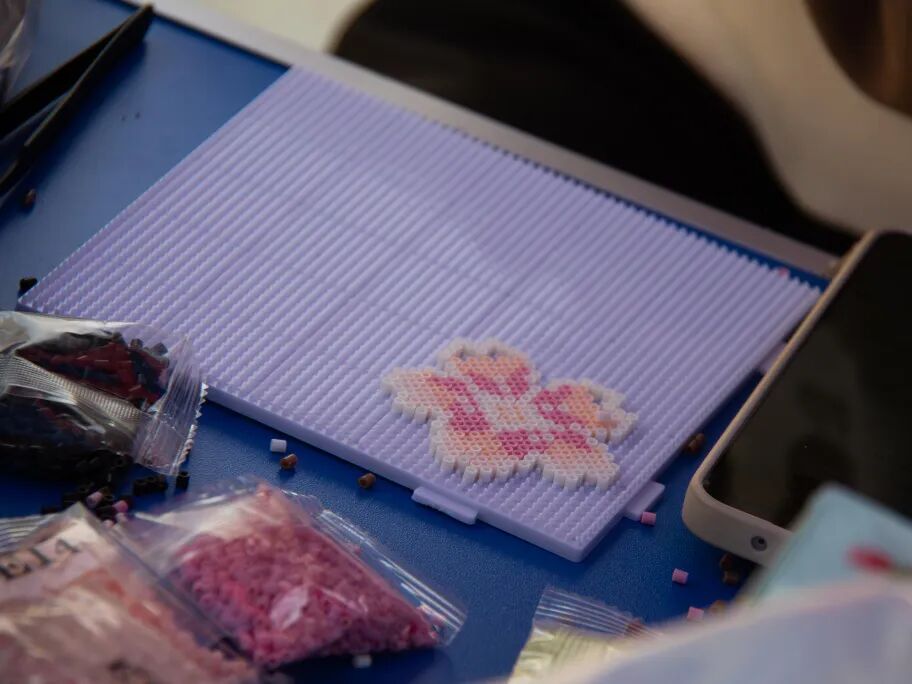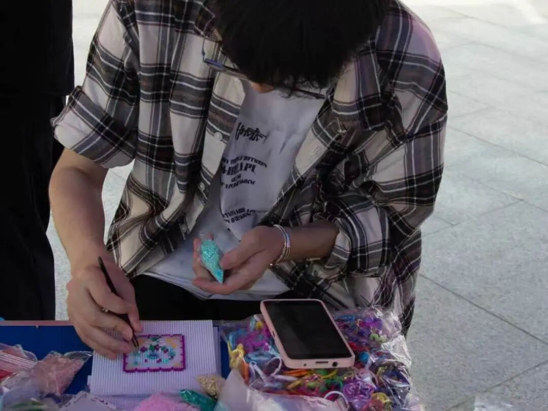 五彩拼豆在桌面上铺展开小小的春日宇宙。有人拼出樱花,有人拼出花神,也有人做出了材料学院专属徽章。镊子起落间,是少年的想象力;熨斗熨过之后,是细碎而真实的快乐。一枚枚拼豆饰物,成为春日里最闪亮的注脚。