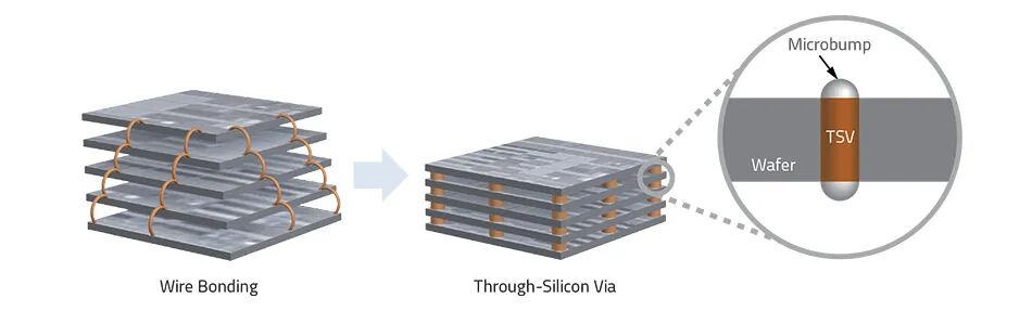而采用硅通孔技术时,会在每颗芯片上垂直钻孔,硅通孔结构从所有芯片的同一固定位置贯穿全部孔洞,连通整叠芯片,整体结构外观类似立体停车楼。