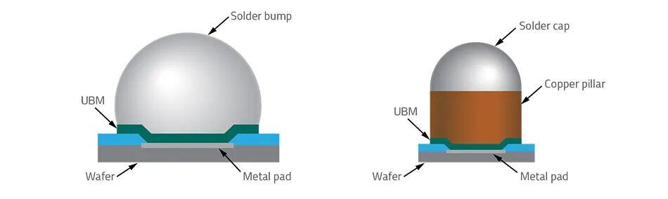 右侧为同款结构,区别在于焊料顶盖与凸块下金属层之间增设了铜柱。