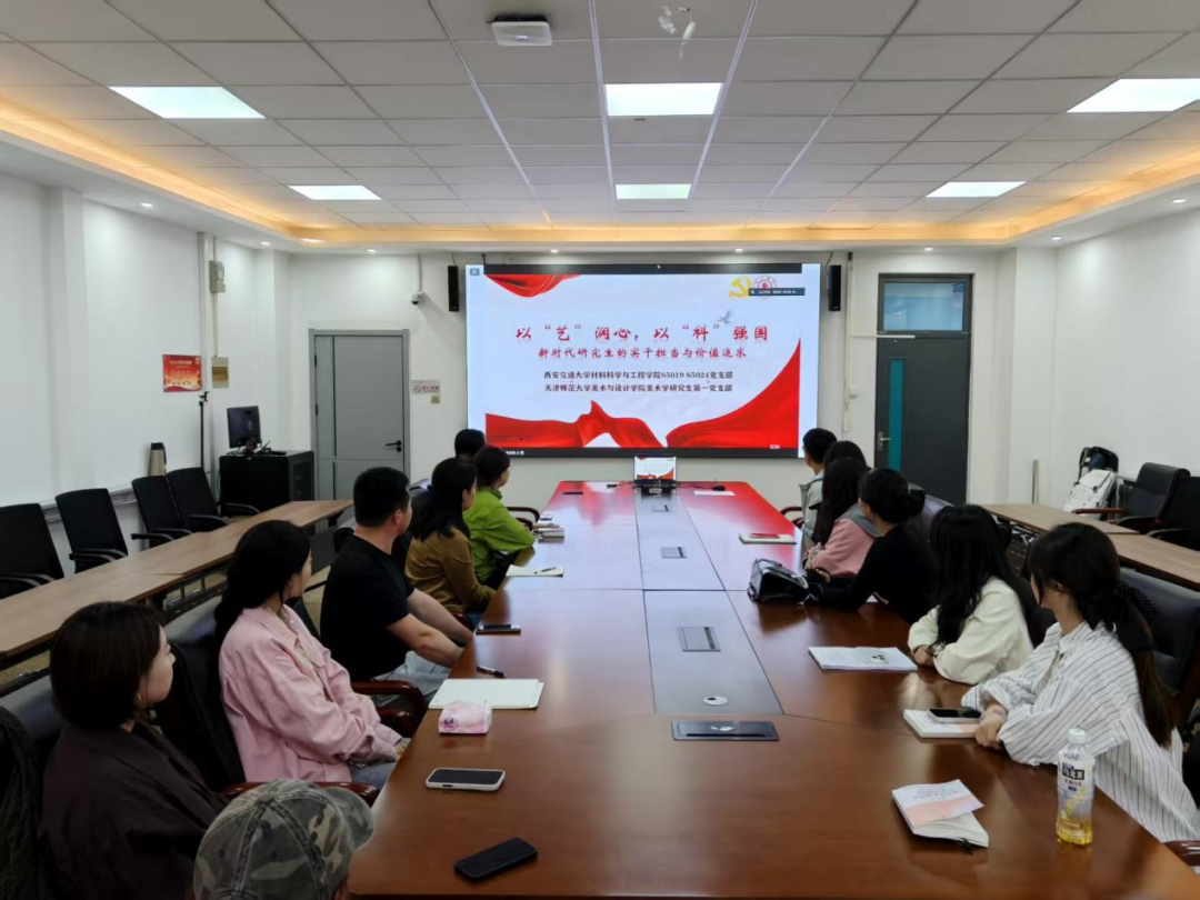 4月22日,西安交通大学材料学院S5019、S5024党支部联合天津师范大学美术与设计学院美术学研究生第一党支部,开展“以‘艺’润心,以‘科’强国——新时代研究生的实干担当与价值追求”主题党课活动。本次活动旨在深入学习贯彻习近平新时代中国特色社会主义思想,进一步加强高校研究生党支部联学共建,以党建引领美育活动开展,积极搭建美育教育平台,同时推动跨学科科研交流平台建设,为支部党员的科研工作提供科研绘图、学术可视化等领域的经验交流和合作渠道,促进党建与学科特色、美育实践、科研创新深度融合,凝聚青年学子的奋进力量。