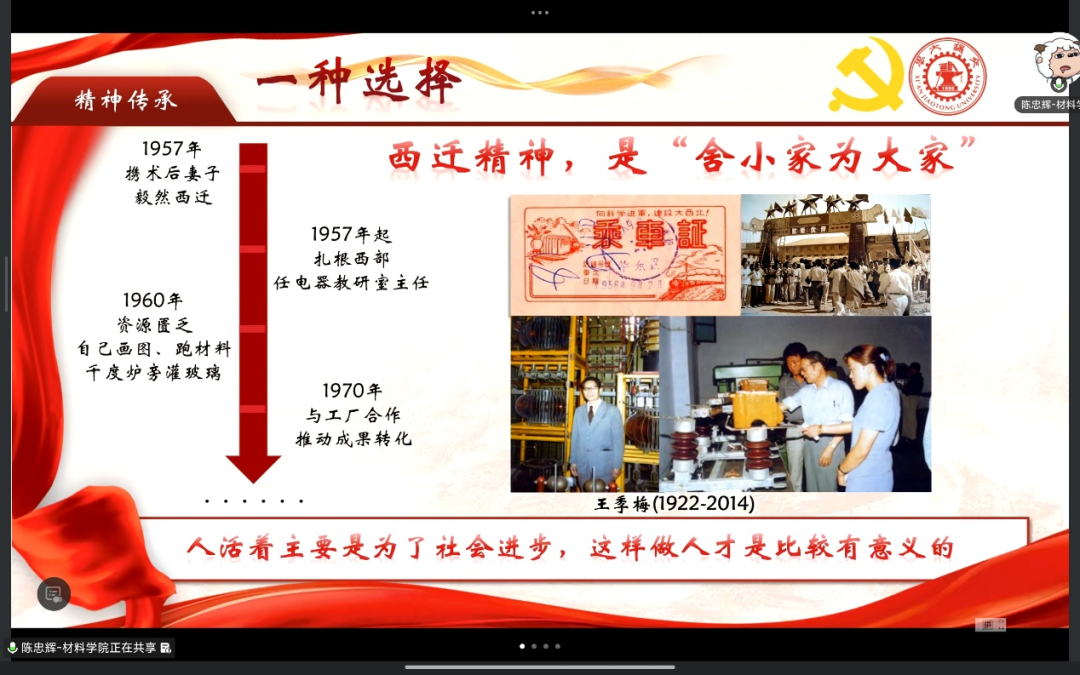 本次活动以跨校联学的形式开展,围绕新时代研究生党员如何立足专业特色、坚定理想信念、服务国家发展展开深入交流。活动中,西安交通大学材料学院党支部围绕“西迁精神”作专题分享,主讲人结合西安交通大学建校130周年暨西迁70周年的重要节点,以西迁博物馆“西迁先贤业绩展”中的一件珍贵展品为切入点——系统阐释了以“爱国主义”为核心、以“听党指挥跟党走,与党和国家、与民族和人民同呼吸、共命运”为精髓的精神内核,展现了交大研究生党员聚焦国家重大战略需求、深耕科研创新、勇担科技报国使命的责任意识和精神风貌。通过学习交流,与会党员更加深刻地感受到西迁精神的时代价值,也进一步增强了将个人理想融入国家发展大局的思想自觉和行动自觉。大家纷纷表示,要牢记“国家需要在哪里,我们就到哪里”的誓言,聚焦国家重大战略需求,深耕科研创新,勇担科技报国使命,在促进产学研深度融合上实现更多突破,为建设教育强国、科技强国、人才强国贡献青春力量。