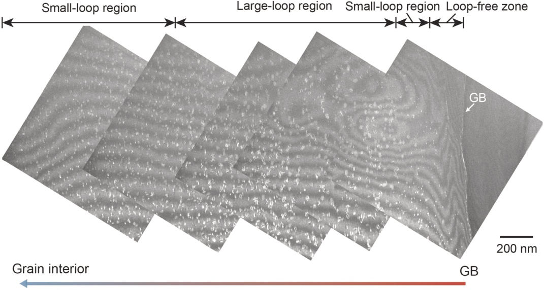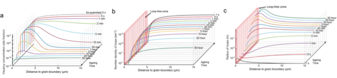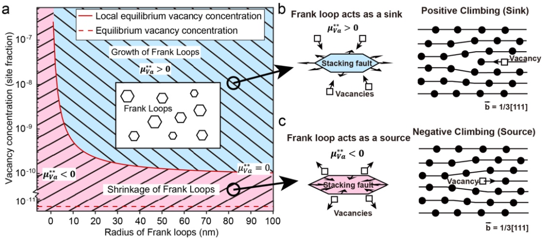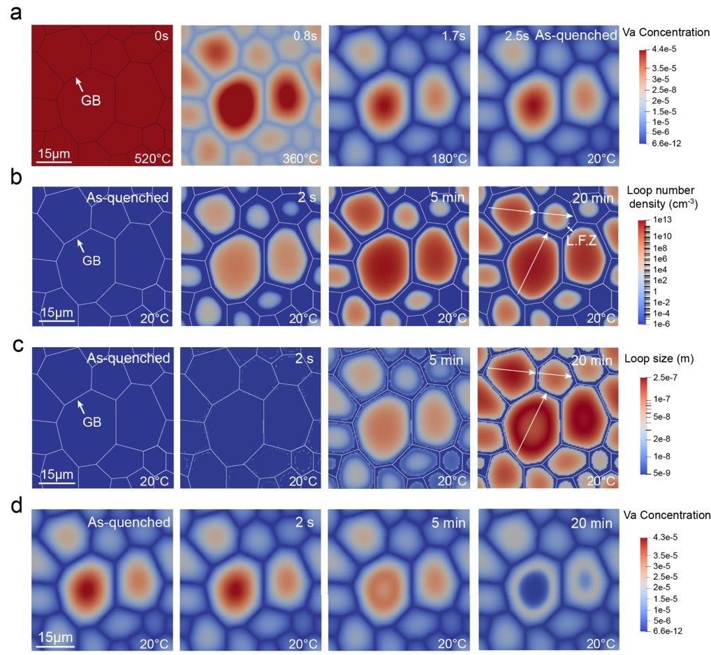 研究团队建立了空位团簇形核与长大物理模型,能够描述空位扩散、湮灭以及Frank环的形核和长大过程。模拟结果与实验表征获得的Frank环尺寸及数密度的空间分布特征一致,并揭示了其形成机理:晶粒内部较高的空位过饱和度促进Frank环快速形核,导致局部空位迅速耗尽,从而抑制Frank环后续长大;而空位在晶界处的湮灭使晶界邻近区域内的空位浓度降低,抑制Frank环形核但有利于已有Frank环的长大。