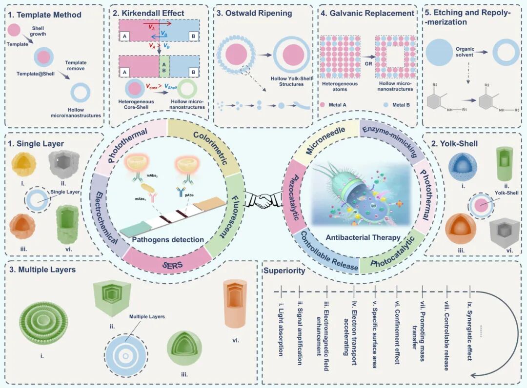 图1. 用于病原体诊疗的空心微/纳米结构方案,包括合成策略、结构特征、优势和应用。