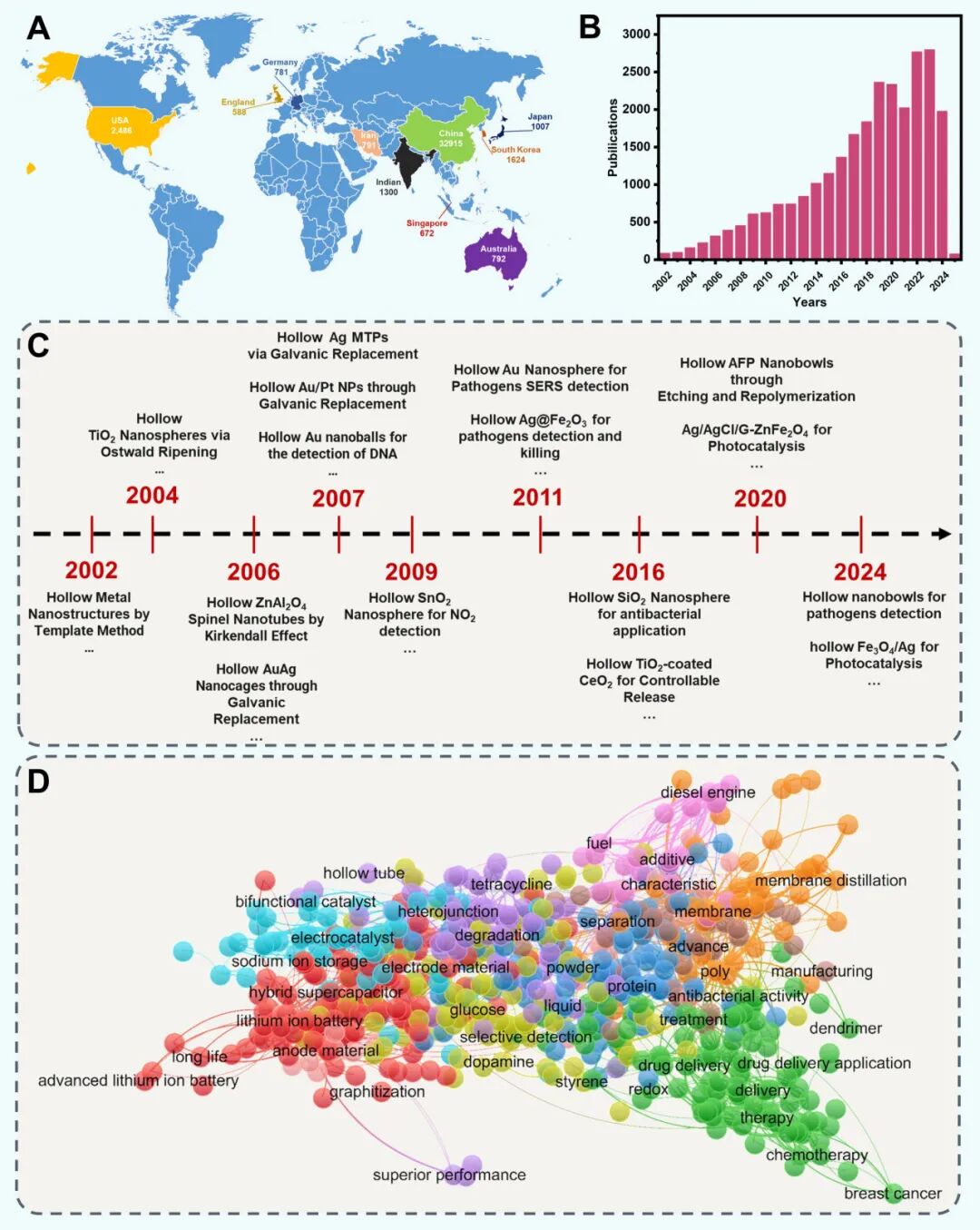 基于Web of Science数据分析,自2002年以来,全球已有140多个国家发表了超过26000篇关于空心微纳米结构的同行评议论文,研究领域涵盖能源存储、生物传感、催化、环境科学及食品科学等。空心结构因其高表面体积比、可调的空腔及限域效应,成为材料科学的前沿热点。