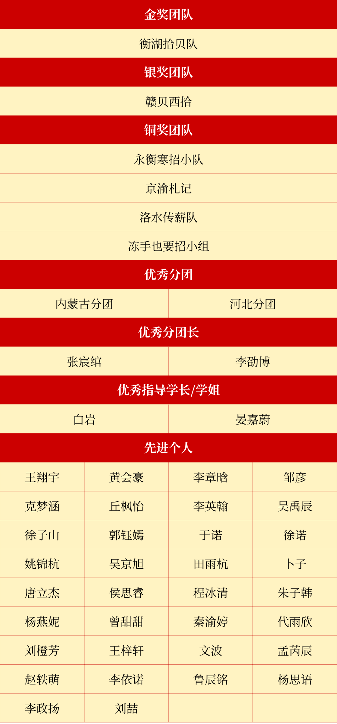 以冬为序,赴梦之约以春为期,载誉而归2026年北京科技大学“把我的大学带回母校”寒假招生宣传实践活动落下帷幕材料科学与工程学院再添荣光!获评优秀分团2支金奖团队1支银奖团队1支铜奖团队4支优秀指导学长2位优秀分团长2位寒招先进个人34人材子材女用行动诠释“学厚质朴,百炼成材”话不多说,一起解锁材院学子的高光时刻吧!金奖团队衡湖拾贝队承衡湖文脉,筑钢铁脊梁衡湖拾贝队奔赴河北省衡水市,深入12所中学,