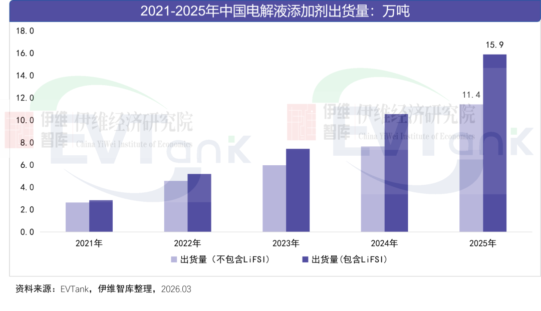 近日,研究机构EVTank联合伊维经济研究院共同发布了《中国锂离子电池电解液添加剂行业发展白皮书(2026年)》。白皮书指出,在下游锂电池需求高增长和添加比例提升的驱动下,2025年中国锂电池电解液添加剂出货量为15.9万吨(包含LiFSI),同比增速高达50.6%。随着终端细分市场需求持续优化,添加剂在电解液的占比逐步提升,目前电解液中用量最大的是VC、FEC、PS等常规添加剂。随着全球储能装机