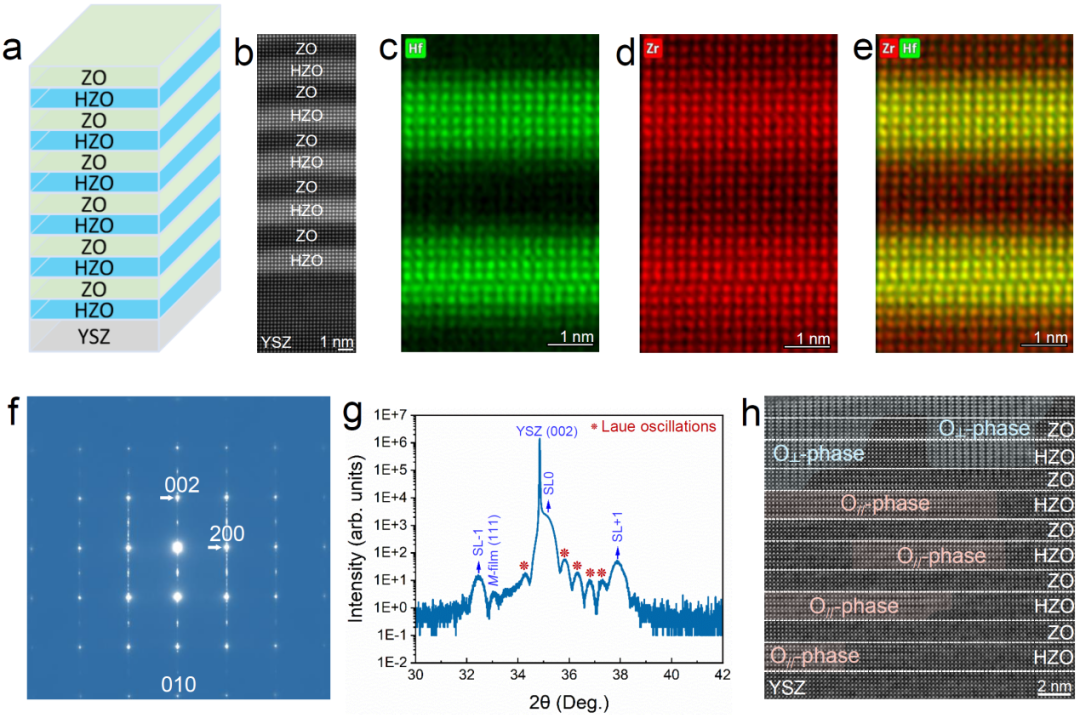 近日,松山湖材料实验室、中国科学院东莞材料所和西安电子科技大学多个研究机构组成的研究团队,在铪基超晶格薄膜结构相变机制研究中取得重要进展,相关研究成果于2026年3月31日在《自然·通讯》(Nature Communications)在线发表。基于二元HfO₂的铁电材料因与CMOS工艺兼容且具备纳米尺度的强铁电性而备受关注,但其铁电相(亚稳正交相)在常温常压下极不稳定,易转变为单斜或四方相,导致薄
