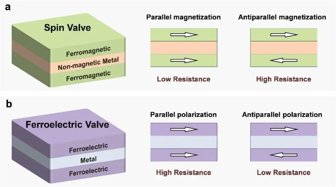 自旋阀是一类通过调控铁磁层中自旋取向实现电阻调制的多层薄膜器件,通常由交替堆叠的铁磁性与非磁性金属层构成,为高集成度、高性能自旋电子技术的发展提供了关键支撑,在磁存储、磁传感及自旋电子学等领域展现出重要应用价值。鉴于铁电性与铁磁性在物理概念与宏观响应行为上具有高度类比性,构建一种结构类比自旋阀、可通过调控相邻铁电层极化方向来实现电阻调控的“铁电阀”(Ferroelectric Valve)器件,具