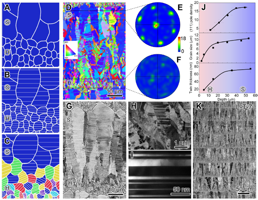 长期以来,强度与塑性之间的倒置关系一直是结构金属材料发展的共性瓶颈。基元序构设计策略为破解这一困境提供了全新思路:通过精确调控跨尺度基元的空间梯度排列,发挥基元间的协同效应,诱导塑性应变梯度,激发高密度几何必需位错,从而实现其综合性能非线性提升。目前,多数序构金属材料仍以尺寸梯度设计为主(如调控晶粒尺寸、孪晶片层厚度等),通过构建屈服强度梯度来形成塑性应变梯度以获得强化。然而,这种梯度变形主要发生