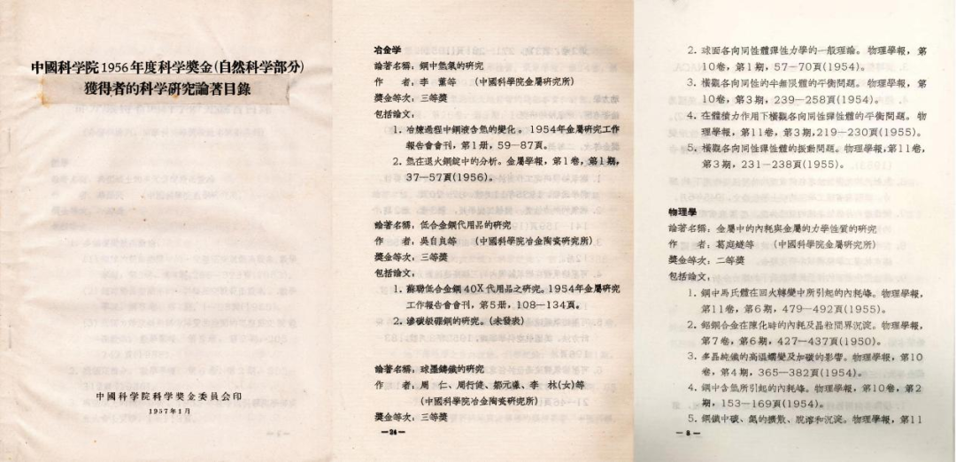 岁月“鎏”金——2026年度档案编研宣传系列活动“岁月鎏金·初获荣耀”1956年度中国科学院科学奖金1955年8月31日,国务院发布《中国科学院科学奖金暂行条例》,决定设立科学奖金,奖励在科学领域做出重要成果的中国科学家。这是新中国对自然科学和社会科学理论研究工作给予奖励的第一个条例。中国科学院1956年度科学奖金(自然科学部分)获得者的科学研究论著目录经过为期1年多的评审,最终从全国申报的419