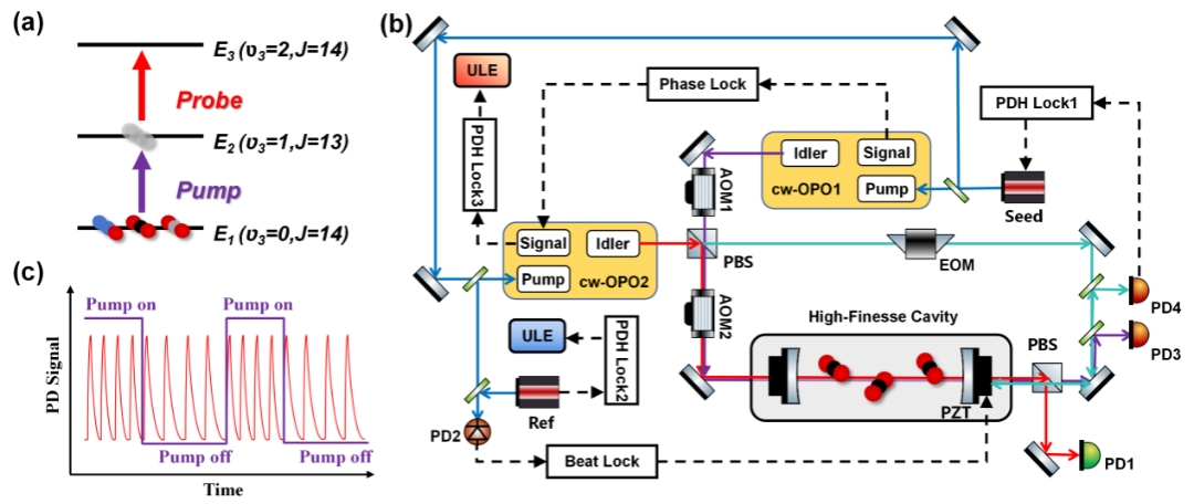 该研究的基本思路是将双共振光谱方法与腔增强光谱技术相结合,通过泵浦—探测机制对目标分子进行选择性激发,并利用差分测量策略有效抑制背景吸收干扰。在实验方案中,研究团队选取¹⁴CO₂特定振动跃迁作为泵浦与探测通道,利用两束中红外激光分别与分子的不同能级跃迁发生共振作用。泵浦光首先将分子从基态激发至振动中间态,随后探测光仅对处于该中间态的分子进行腔衰荡光谱测量,从物理机制上实现了对¹⁴CO₂分子的选择性“标记”和读取。