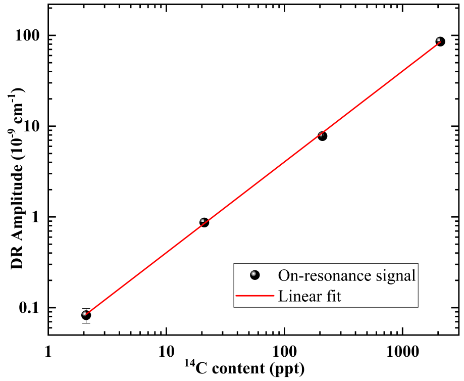 在性能验证方面,研究团队对一系列具有不同¹⁴C丰度的二氧化碳样品进行了系统测量。实验结果表明,双共振差分信号强度与¹⁴CO₂浓度在近三个数量级范围内呈现良好的线性关系,拟合斜率的相对标准误差约为2%,显示出该方法优良的定量检测能力。此外,对¹⁴C丰度约为1.074 ppt的样品进行多次重复测量,其测量结果的相对标准差约为5%,表明该系统在极低丰度条件下仍具有良好的重复性和稳定性。