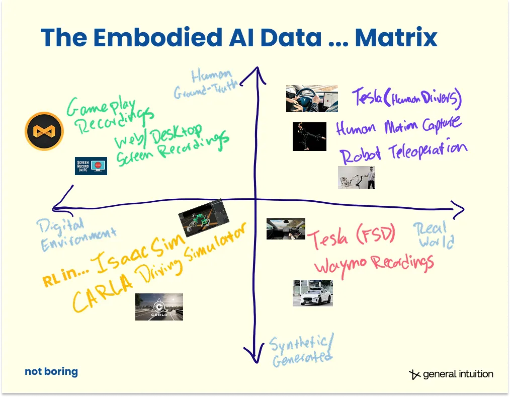 最接近的类比是 GitHub 数据。它捕获了人类工程师编码的历史,被用来训练出了能比人类编码更好的机器。问题是这个想法在计算机之外是否也能工作。General Intuition 相信(并正在看到迹象),从游戏数据中学习可以迁移到物理世界。