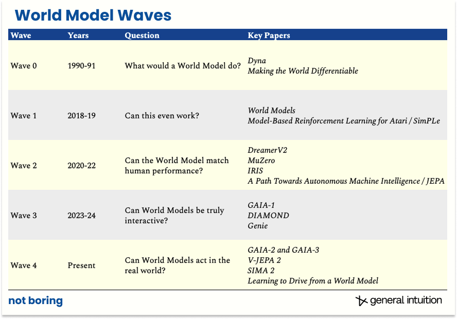 3 月 19 日,科技博客 Not Boring 的作者 Packy McCormick 与 General Intuition CEO Pim De Witte 联合发表了一篇约两万英文字的长文,题为“World Models: Computing the Uncomputable”,系统梳理了世界模型的历史、技术路线、竞争格局与未来前景。这可能是目前公开发表的关于世界模型最完整的综述性文章。