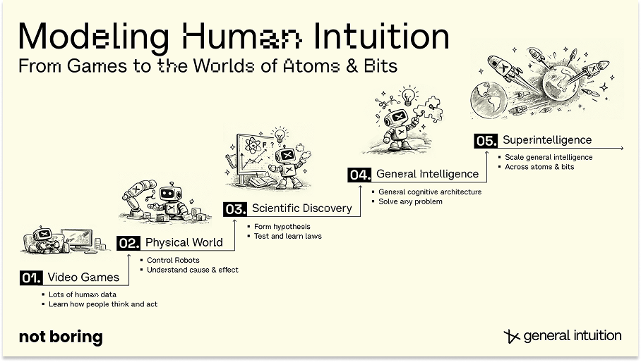 简而言之:如果你可以用游戏控制器控制几乎任何物理系统,而 General Intuition 拥有世界上最多的“玩家使用控制器采取动作时会发生什么”的数据,他们的 Agent 应该能够控制几乎任何物理系统。