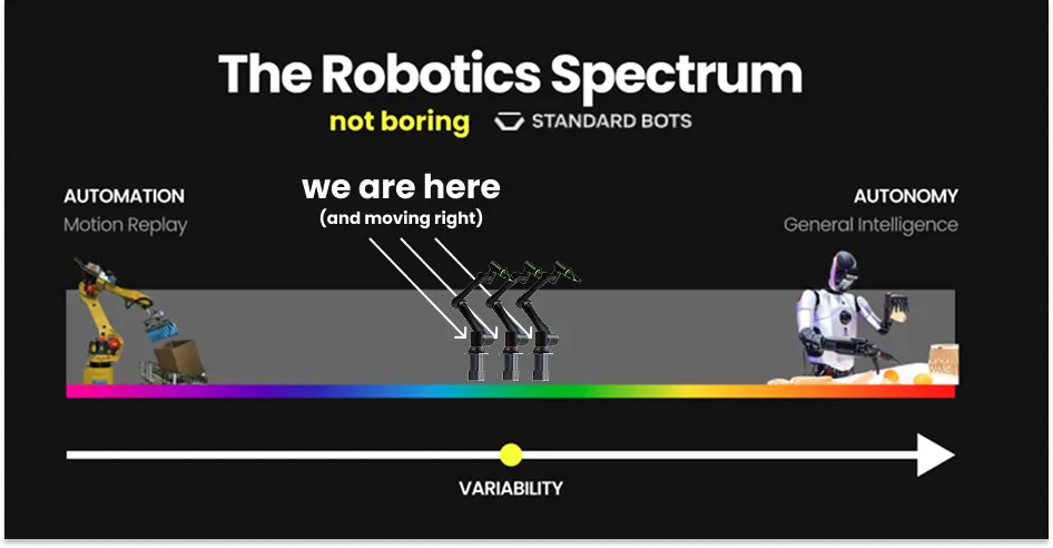 Not Boring 之前关于机器人的文章写过,构建经济上可行的具身 AI 有两种方法:小步(Small Step)或大跃(Giant Leap)。Standard Bots 追求小步方法:在现场边赚钱边学习,一个用例接一个用例。他们跨越许多不同的行业和任务收集多样的真实世界数据。