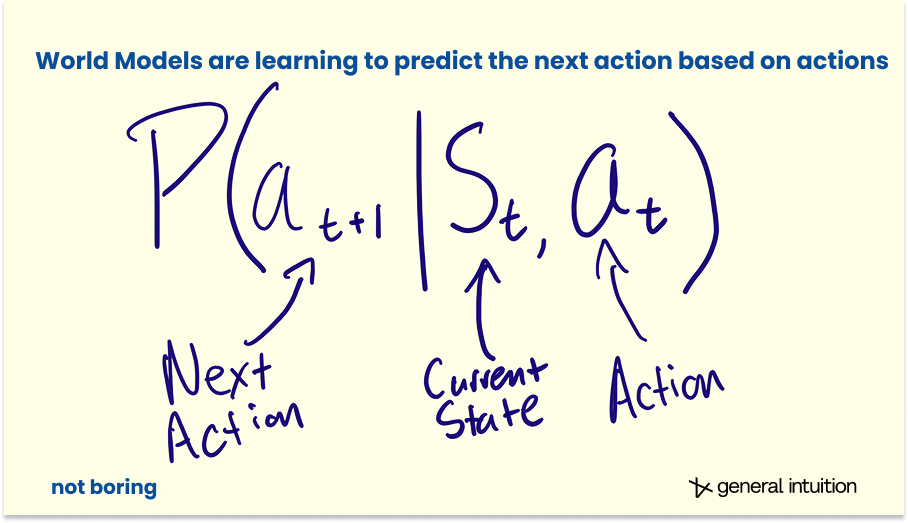 General Intuition 认为(并且正在看到早期迹象),世界模型是一种新的、对于需要深度时空推理的环境而言可能比 LLM 更强大的基础模型类别。像我们的现实世界这样的环境。