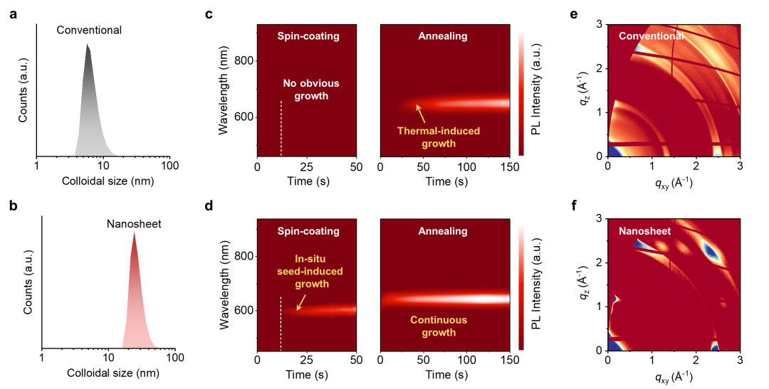 图2:常规体系与纳米片体系的结晶动力学全过程对比。前驱体溶液的动态光散射(a, b),成膜过程的原位PL光谱(c, d),以及最终薄膜的晶体取向2D-GIWAXS图(e, f)