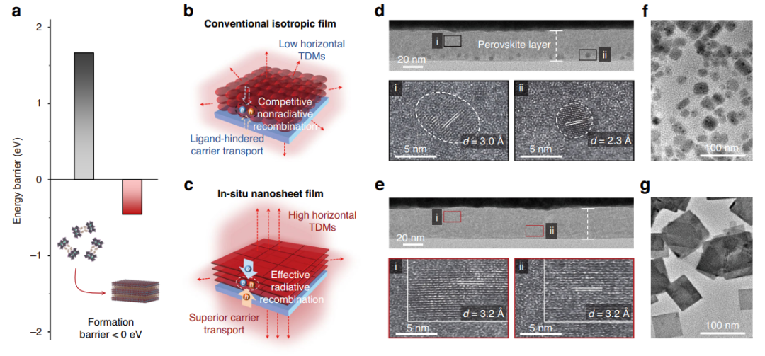 图1:(a) 基于不同配体的钙钛矿纳米片形成能垒计算;(b) 常规各向同性薄膜与 (c) 纳米片薄膜的结构示意图;(d, e)薄膜截面TEM表征;(f, g)薄膜剥离后的晶体TEM表征