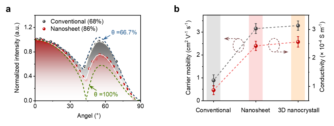 图3:(a) 薄膜水平TDM比例测试拟合;(b) 载流子迁移率对比