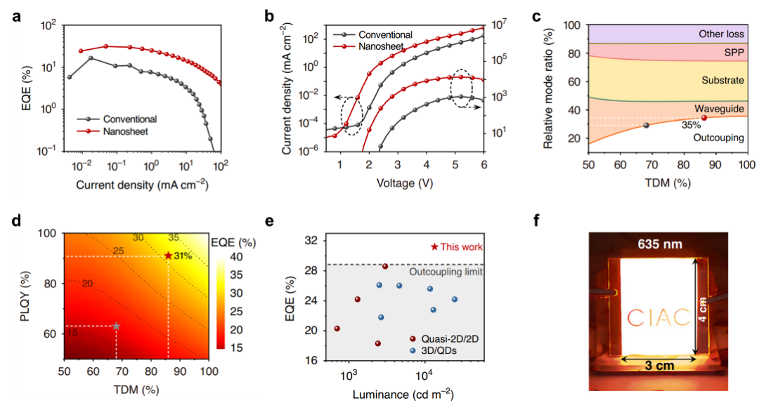 图4:(a) EQE-电流密度曲线;(b) 电流密度-电压-亮度曲线;(c) 两种器件的光提取效率模拟对比;(d) 基于PLQY和水平TDM比例的理论EQE模拟图; (e) 本工作与已报道高性能纯红光PeLED的性能对比;(f) 大面积(12 cm2)发光器件实物展示。