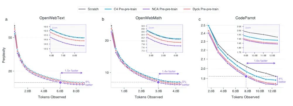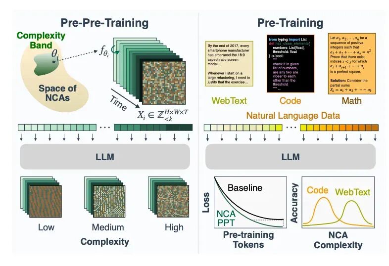 1970 年,数学家约翰·康威发明了“生命游戏”(Game of Life)。在一块无限延伸的棋盘上,每个方格非生即死,遵循几条极其简单的规则:活细胞如果邻居太少就会孤独而死,太多则因拥挤而亡;死细胞恰好有三个活邻居就会复活。没有人下棋,没有人操控,但这些简单规则跑起来之后,屏幕上会涌现出滑翔机、脉冲枪、甚至可以模拟图灵机的复杂结构。半个多世纪以来,这个实验一直被视为复杂性科学的经典演示,展示简单规则如何生成无穷复杂的行为。图丨康威的“生命游戏”(来源:WikiPedia)MIT Improbable AI 实验室 Pulkit Agrawal 团队在今年 3 月发表了一篇论文,提出了一个听起来相当不合常理的想法:用类似“生命游戏”的细胞自动机生成的数据,去预训练大型语言模型。这些数据不包含任何文字、任何语义,只是一个 12×12 网格上像素不断演化的轨迹。图丨Pulkit Agrawal(来源:MIT CSAIL)但实验结果显示,在这些纯粹的“动态图案”上训练过的模型,在随后的自然语言学习中表现得更好,困惑度(perplexity)降低了最多 6%,收敛速度加快了最多 1.6 倍。更让人意外的是,仅用 1.64 亿个细胞自动机 token 做预训练,效果竟然超过了用 16 亿个真实英语文本(来自 Common Crawl 数据集 C4)做同样的预训练。这项工作的核心思路可以用一句话概括:语言模型真正需要学习的,可能不是语言本身,而是语言背后的计算结构。图丨NCA 预预训练到语言预训练的概览(来源:arXiv)研究团队使用的是“神经细胞自动机”(Neural Cellular Automata, NCA),这是经典细胞自动机的一种推广。传统的细胞自动机(比如康威的生命游戏)使用固定的规则,而 NCA 把规则替换成了一个小型神经网络,具体来说是一个 3×3 卷积加上一层 MLP。每次生成训练数据时,研究者随机初始化这个网络的权重,等于随机抽取一条全新的动力学规则,然后让它在网格上跑出一段时空演化轨迹。这些轨迹被切割成 2×2 的图像块,映射为 token 序列,再用标准的下一个 token 预测任务来训练 transformer。换句话说,模型拿到的每一条序列,都来自一个它从未见过的规则。要预测下一个 token,它必须在上下文中推断出这条隐藏规则,然后应用它。这和语言模型在真实文本上做的事情存在某种深层对应。斯坦福大学马腾宇与 Percy Liang 团队在 2022 年的工作中就曾论证,下一个 token 预测本质上是一种隐式的贝叶斯推断:模型从已有的文本中推断出潜在的“生成概念”,再据此预测接下来会出现什么。NCA 训练把这个过程提纯了。自然语言中混杂着语义快捷方式和共现先验,模型可以“投机取巧”;而 NCA 数据中没有任何语义可以依赖,每一个 token 都在迫使模型做纯粹的规则推断。这套方法被称为“pre-pre-training”,即在正式的语言预训练之前,先用合成数据做一轮“预预训练”。训练流程分三步走:先在 NCA 数据上训练 transformer 的非嵌入层权重,再在自然语言语料(网页文本、代码或数学文本)上做标准预训练,最后是针对具体任务的微调。研究者测试了三个下游语料库,分别是 OpenWebText(网页文本,约 90 亿 token)、OpenWebMath(数学文本,约 40 亿 token)和 CodeParrot(代码,约 130 亿 token),在所有三个领域上都观察到了持续的改善。图丨NCA 预预训练在多个领域改进并加速了语言模型预训练(来源:arXiv)在推理基准测试上,收益同样可见。GSM8K 数学推理测试中,NCA 预训练将 pass@1 从 3.8% 提升到 4.4%;HumanEval 代码生成测试中,pass@1 从 6.8% 提升到 7.5%;BigBench-Lite 综合推理测试中,pass@4 从 25.9% 跃升至 36.5%。绝对数字不算大,这些毕竟是 16 亿参数的模型,而非千亿级的商用系统,但对照实验的一致性指向了一个清晰的信号:从非语言数据中习得的某些东西,确实在帮助模型处理语言任务。那么,到底是什么被转移了?研究者做了一个拆解实验:在 NCA 预训练完成后,选择性地重新初始化模型的不同组件(注意力层、MLP 层、LayerNorm 层),然后观察下游表现的变化。结果非常明确:重新初始化注意力权重造成的性能损失最大,远超其他组件。这意味着注意力层承载了最多的可迁移结构。MLP 层的效果则因领域而异:在 OpenWebText 上,保留 NCA 阶段的 MLP 权重反而会干扰语言学习;但在 CodeParrot 上,影响可以忽略不计。这一发现和最近 Jelassi 等人(2025 年)对混合专家(MoE)架构的分析形成了一定程度的呼应,那项工作表明扩大 MLP 参数主要增强的是记忆能力而非推理能力。两相对照,一幅功能分工的图景浮现出来:注意力层负责学习通用的依赖追踪和上下文推断机制,MLP 层则倾向于存储特定领域的模式和统计规律。正因如此,注意力层从 NCA 到语言的迁移是“万金油”式的,而 MLP 的迁移效果取决于源域和目标域之间的匹配程度。研究中另一个值得关注的发现有关于复杂性匹配。团队使用 gzip 压缩率作为 NCA 轨迹复杂性的度量,压缩率低意味着数据更有规律、更可预测,压缩率高则意味着更丰富的时空结构。他们把 NCA 数据按压缩率分成几个区间(20-30%、30-40%、40-50%、50% 以上),分别测试各区间对不同下游领域的迁移效果。结果表明,网页文本和数学文本从高复杂度 NCA(50%+ 压缩率)中受益最大,而代码领域的最优区间在中等复杂度(30-40%)。有意思的是,这恰好与目标语料自身的复杂度特征对齐,OpenWebText 和 OpenWebMath 的 gzip 压缩率在 60-70%,CodeParrot 则只有 32%。这意味着,合成数据不是“越多越好”或“越复杂越好”,而是需要与目标领域