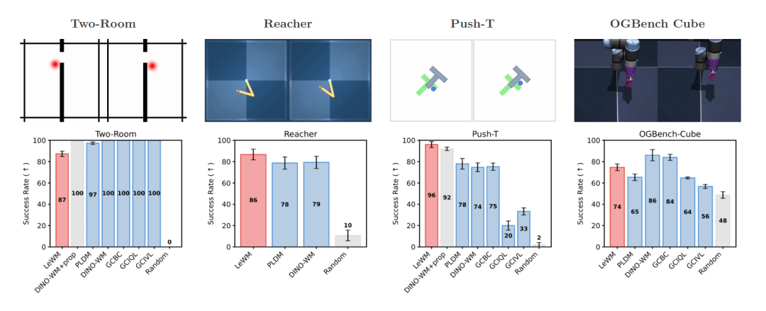 图 | LeWM 在不同任务测试中的表现(来源:上述论文)