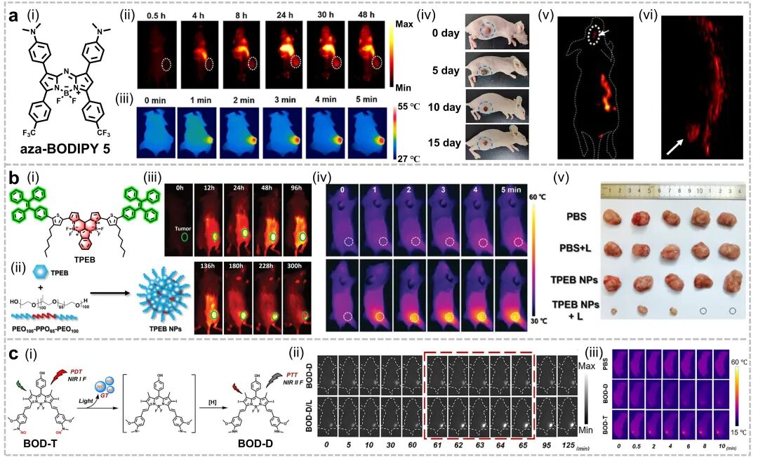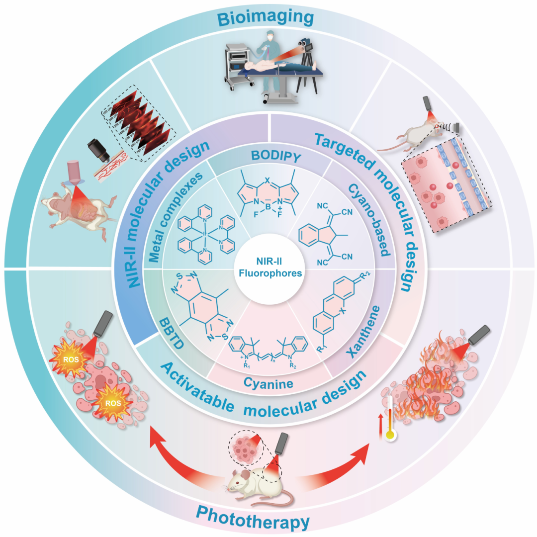 在光疗领域,有机小分子NIR-II荧光探针通过功能集成,实现了成像与治疗的一体化,展现出独特优势。通过合理的分子结构设计,该类分子不仅能够提供高质量的NIR-II荧光成像,还可在光激发下高效地将光能转化为热能或活性氧,从而用于光动力治疗与光热治疗。