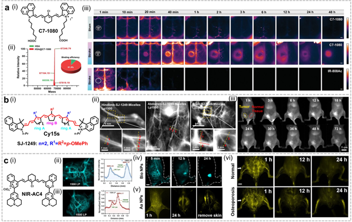 基于NIR-II波段组织散射弱、自发荧光背景低的光学优势,有机小分子NIR-II荧光探针在活体深部组织及肿瘤成像中展现出显著的应用潜力。相较于传统可见光与近红外一区成像,该类探针在成像深度、空间分辨率与信噪比上均实现显著提升,能够清晰呈现肿瘤组织、精细血管网络及关键器官的高对比度影像。